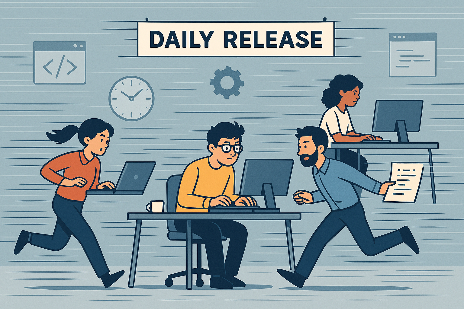 Við báðum gervigreindina um mynd við þessa færslu af hugbúnaðarþróun þar sem útgáfur eru því sem næst daglegar. Ágætis tillaga þó að við hlaupum ekki oft um með svífandi ferðatölvur eða pappírsskjöl hér í þróunarteyminu 😄
